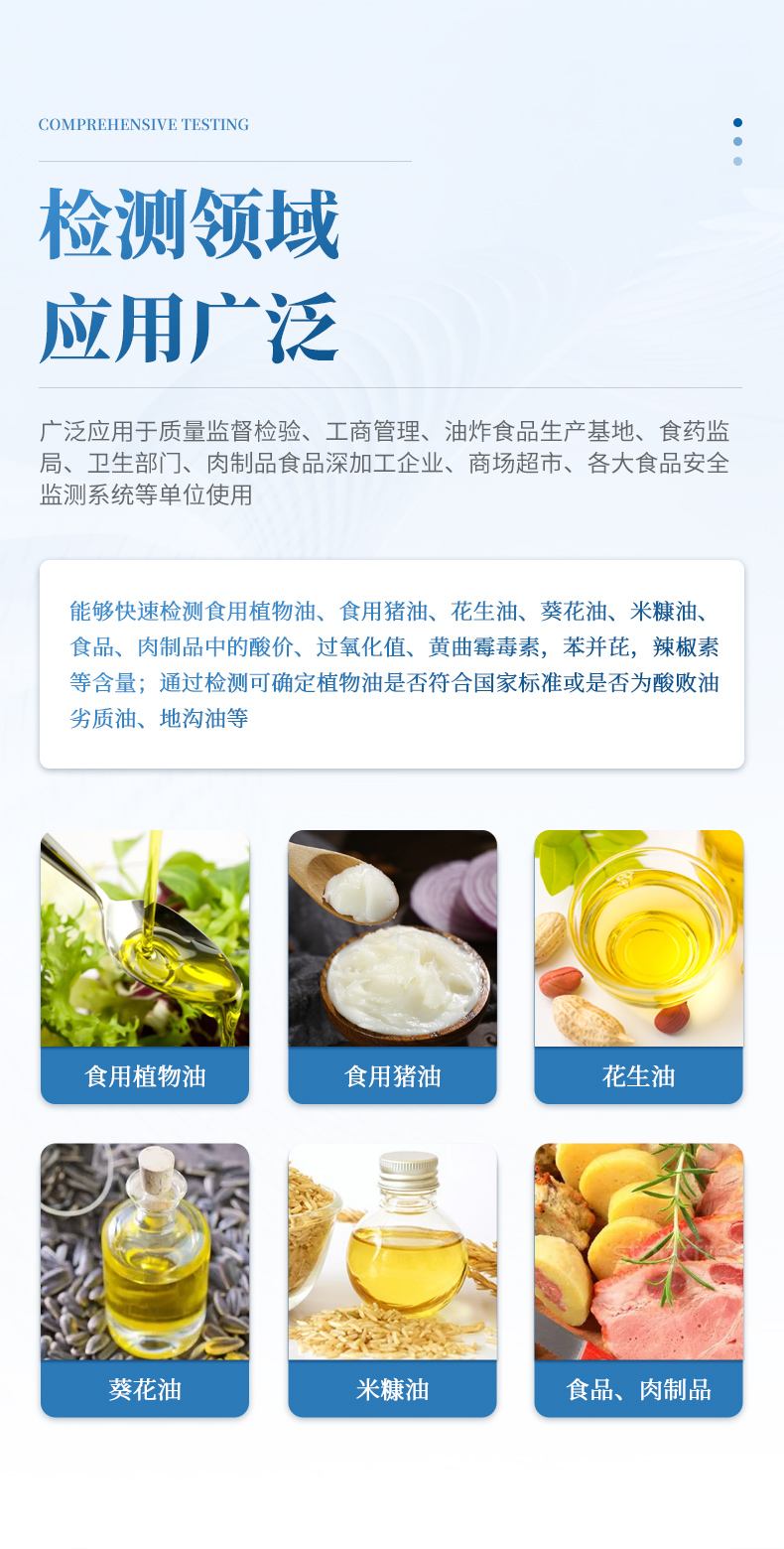 廣泛應用于質量監督檢驗、工商管理、油炸食品生產基地、食藥監局、衛生部門、肉制品食品深加工企業、商場超市、各大食品安全監測系統等單位使用。