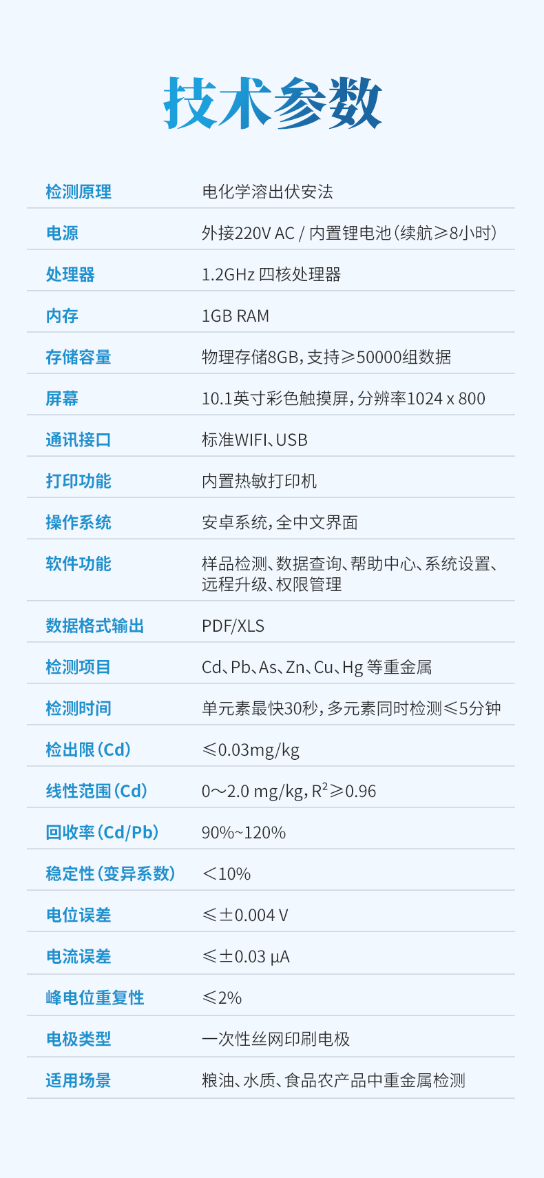| 適用場景 | 糧油、水質、食品農產品中重金屬檢測 |