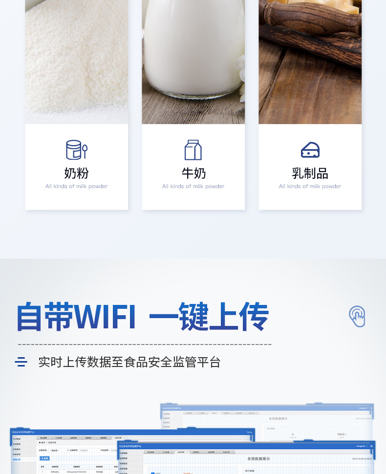 6、儀器帶有監(jiān)管平臺。檢測結(jié)果可直接無線上傳。進行數(shù)據(jù)分析處理,檢測乳制品等長短期動態(tài),達到問題預估、預警。