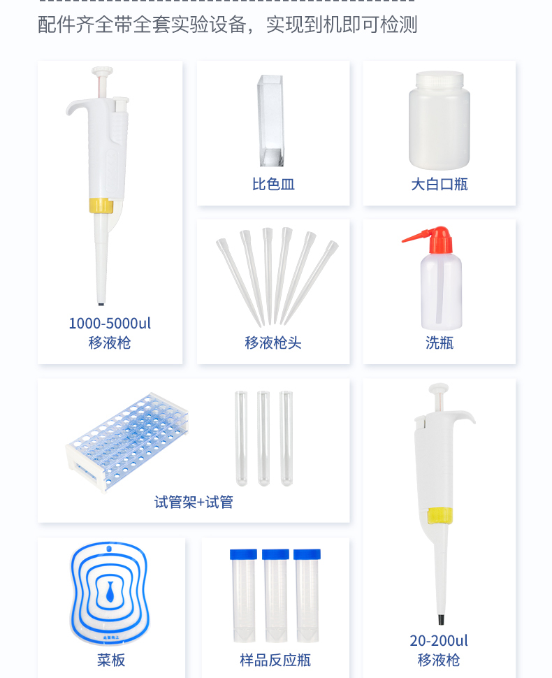 7. 專用試劑盒:配備專用的預制試劑,縮短試劑配制時間,操作簡單,使用方便。