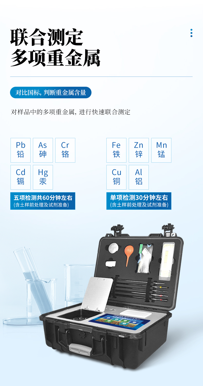 可對土壤、肥料、作物、蔬菜、水果、水質、食品等樣品中的砷、鉛、鎘、鉻、汞、鐵、鋁、鋅、錳、銅等進行快速聯合測定。