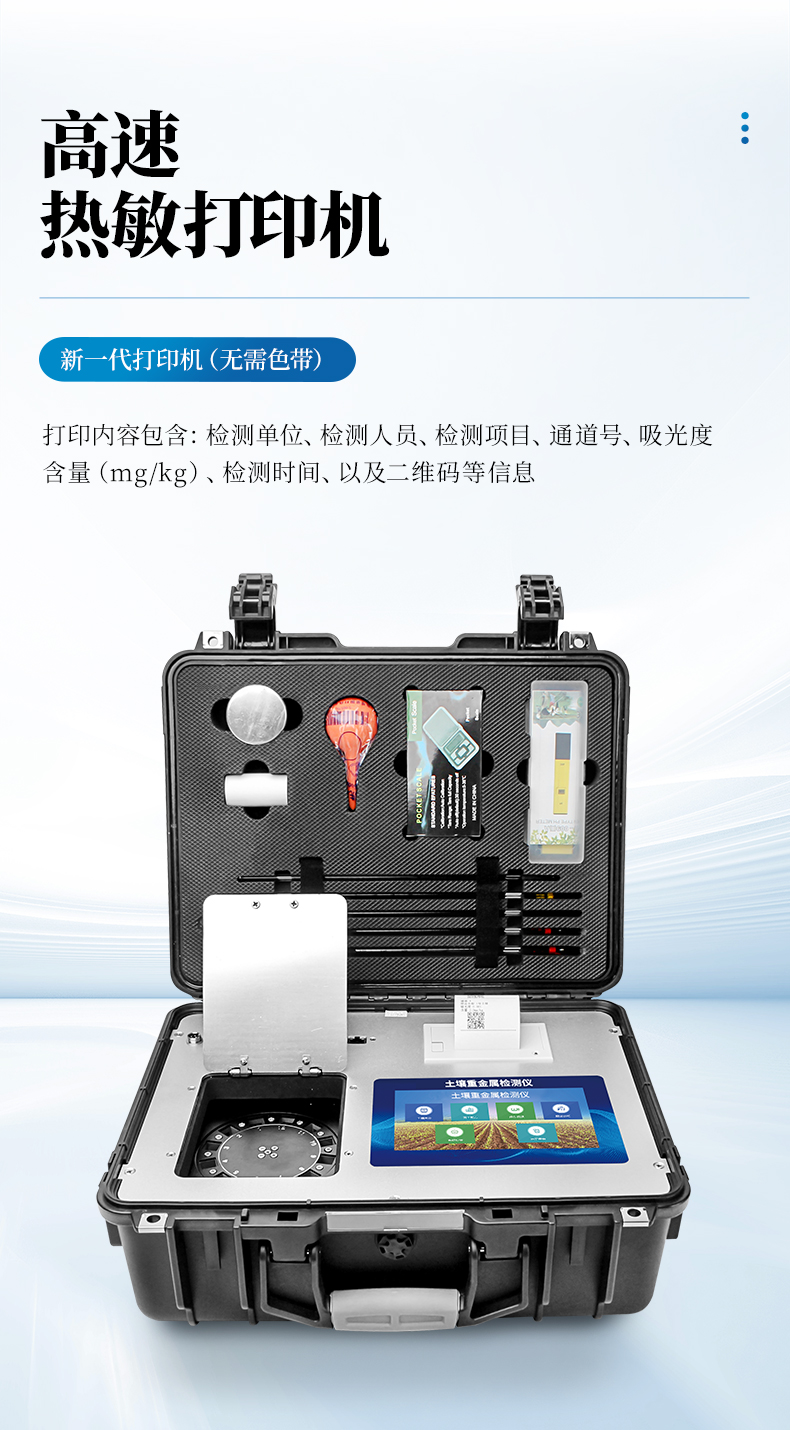 13、內置新一代高速熱敏打印機(無需色帶),打印內容包含:檢測單位、檢測人員、檢測項目、通道號、吸光度、重金屬含量(mg/kg)、檢測時間、以及二維碼等信息