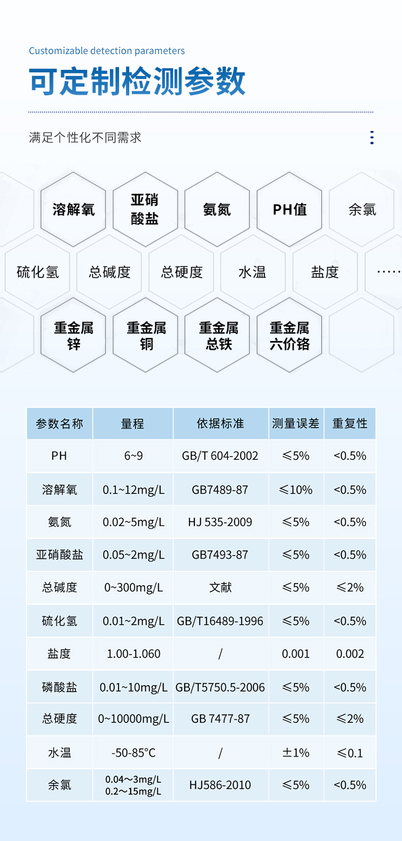 余氯、總氯、有效氯、氨氮、溶解氧、pH、濁度、懸浮物、二氧化氯、臭氧、尿素、色度、氯化物、氰尿酸、硫化氫、亞硝酸鹽、磷酸鹽、總硬度、總堿度、水溫、鹽度等20多種檢測(cè)指標(biāo)任選4種;