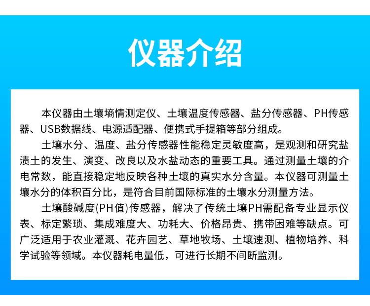 土壤水分溫度測定儀采用FDR頻域反射原理,快速準確測量土壤中含水量及溫度,可對多處樣地、不同土壤深度的水分含量和溫度進行快速檢測和長期連續監測。廣泛應用于土壤墑情檢測、旱作節水灌溉、精細農業、林業、地質勘探、植物培育等領域。