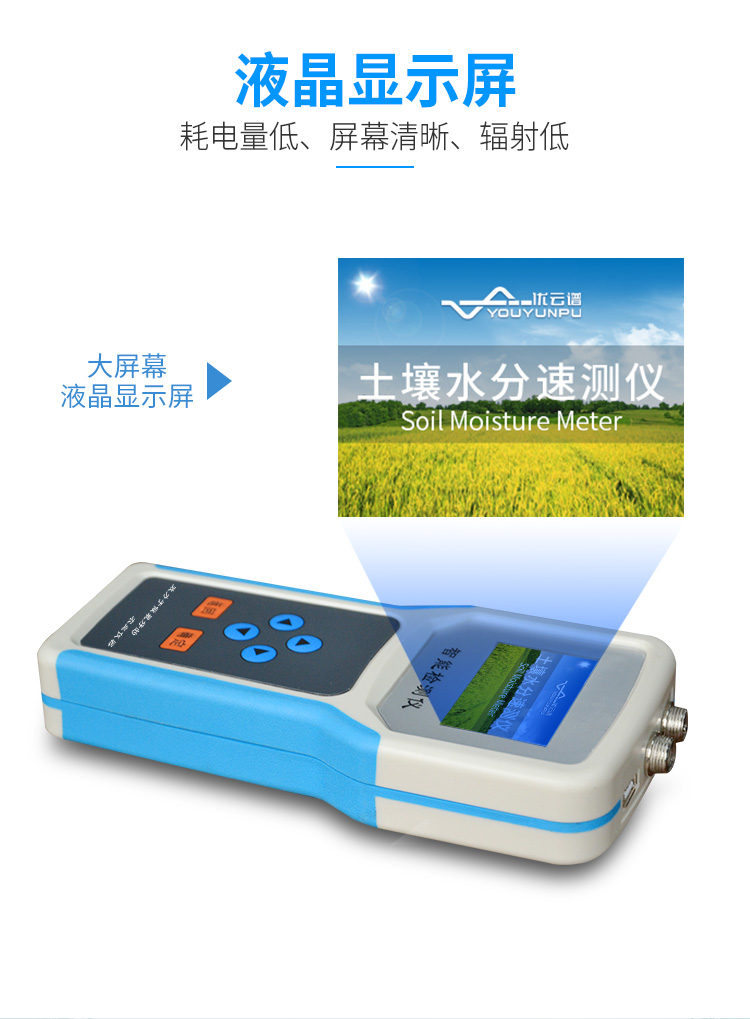 4、大屏幕中文液晶顯示,可實時顯示溫度值、水分值、組數、低電壓示警,存儲數據等,便于野外攜帶作業。