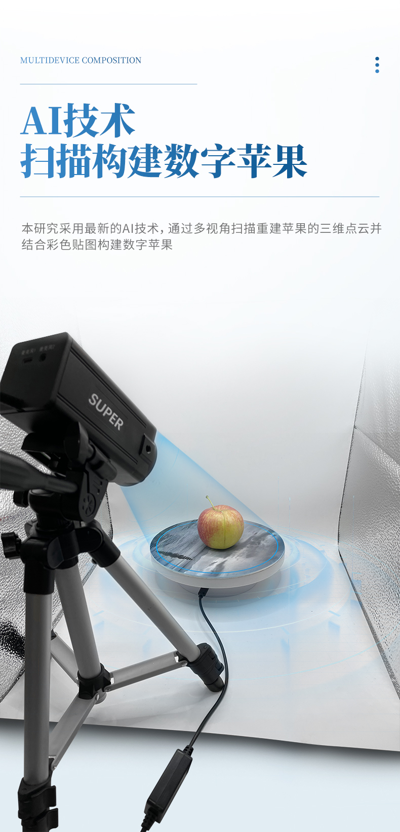 蘋果的表型參數是品種培育、品質檢測、果樹管理中的重要指標,包括形態參數、顏色特征、紋理特征及內部品質等參數。由于蘋果是一個不規則的球體,不同品種蘋果外形差異大,常規方法如皮尺、排水法、圖像處理等方法難以準確測量蘋果表型參數。本研究采用最新的AI技術,通過多視角掃描重建蘋果的三維點云并結合彩色貼圖構建數字蘋果,從虛擬的數字蘋果中您可以欣賞蘋果表型之美,探索無限研究樂趣