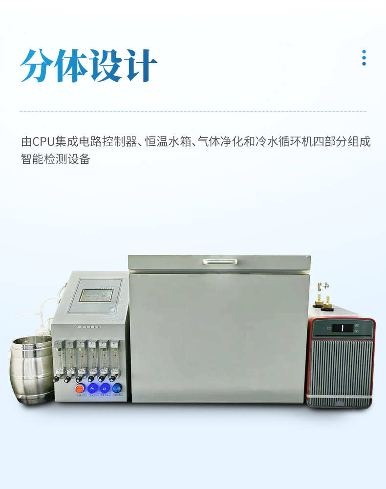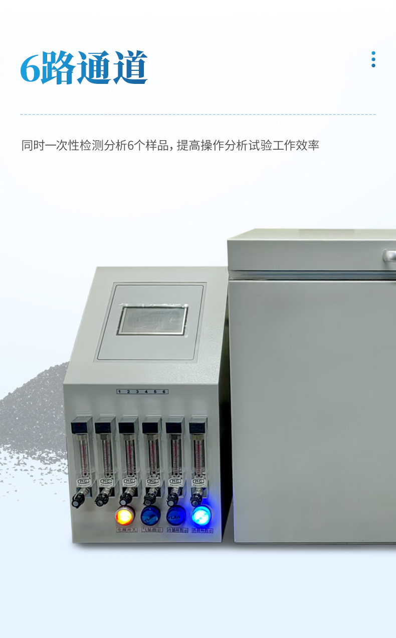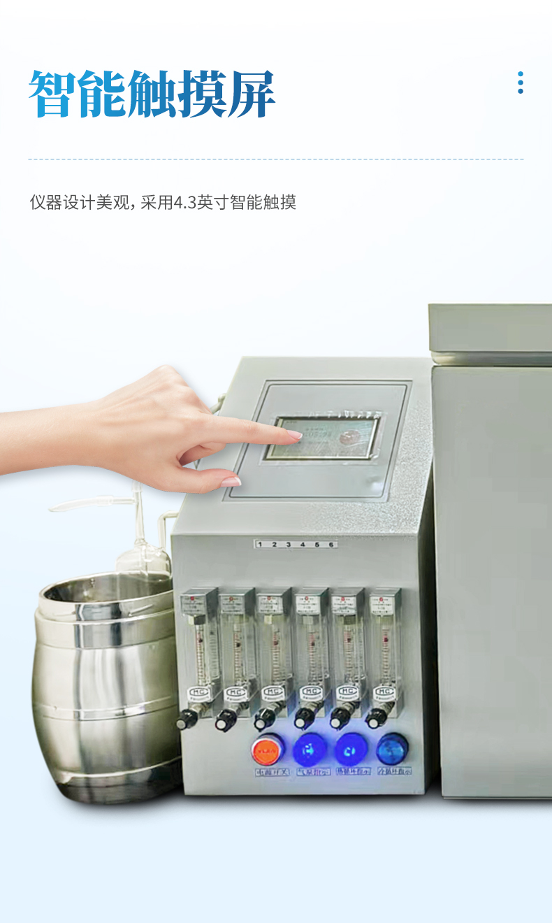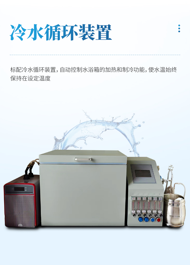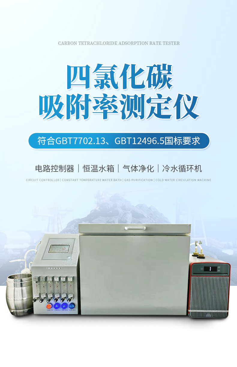 四氯化碳吸附率測定儀適用于活性炭四氯化碳(活性)吸附率的測定;符合GBT7702.13、GBT12496.5國標要求:1儀器設計美觀,采用4.3寸智能觸摸屏,標配冷水循環裝置,自動控制水浴箱的加熱和制冷功能,使水溫始終保持在設定溫度,全新智能計時功能,可任意設置工作時間,避免了人工計時的不確定性。采用分體設計,由CPU集成電路控制器、恒溫水箱、氣體凈化和冷水循環機四部分組成智能檢測設備,設計6路通道(8通道),同時一次性檢測分析6個樣品,提高操作分析試驗工作效率。采用高精度鉑探頭,非固定方式的探頭設計,可隨時測定水浴箱內每個地點的溫度。采用進口保溫材質,恒溫效果極佳,從而更加節能。