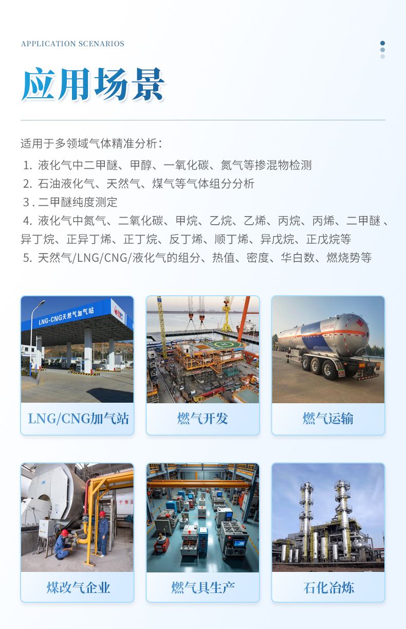 LPG LNG CNG加氣站、油田氣、煤層氣、礦井氣、頁巖氣、燃氣管道運輸公司、燃氣運輸公司、燃氣儲備站、煤改氣企業、LNG點供、燃氣具生產企業、石油煉化、焦化廠、冶煉廠和供氣站等眾多行業。