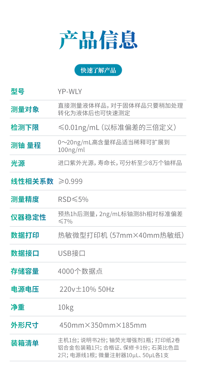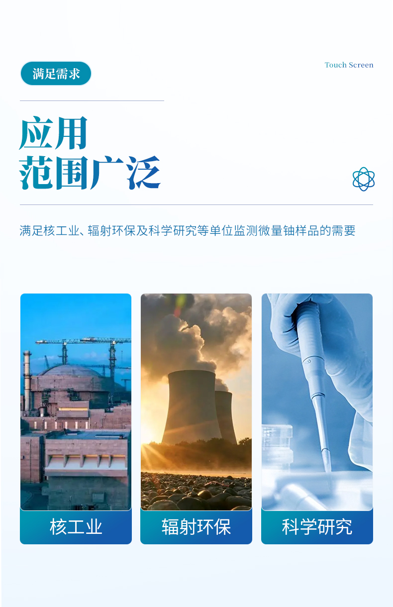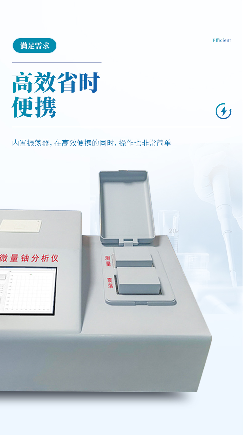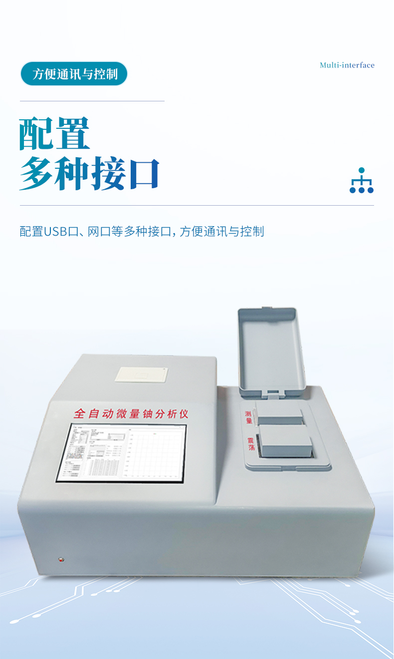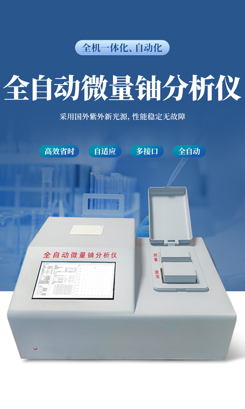 為了滿足核工業(yè)、輻射環(huán)保及科學(xué)研究等單位監(jiān)測微量鈾樣品的需要,我公司最新研制成功全自動微量鈾分析儀。儀器設(shè)計采用國外著名公司生產(chǎn)的紫外新光源,該光源的主要特點(diǎn)是性能穩(wěn)定無故障;所用的脈沖光管壽命≥5 年,如用標(biāo)準(zhǔn)加入法能分析8萬個樣品。電路設(shè)計采用新型的單片機(jī),測試時的所有操作只要按中文提示輕輕點(diǎn)擊液晶觸摸屏上的對應(yīng)選項(xiàng),設(shè)備內(nèi)置震蕩功能,避免了外部使用振蕩器的問題,全機(jī)一體化、自動化。震蕩完成后可選擇就可用標(biāo)準(zhǔn)加入法、工作曲線法分析樣品。并由單片機(jī)自動作出回歸曲線,線性回歸方程式,直接進(jìn)行數(shù)據(jù)處理,液晶屏顯示及打印機(jī)打印能同時給出樣品測試的最終結(jié)果。該儀器設(shè)有以太網(wǎng)100Base-T4網(wǎng)口。可把測試數(shù)據(jù)直接輸入計算機(jī),是同類儀器的升級換代產(chǎn)品。