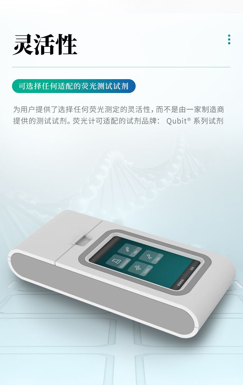 熒光計(jì)采用熒光檢測原理,上樣體積僅需1-20ul,配合相應(yīng)的定量試劑即可實(shí)現(xiàn)精確濃度定量。熒光計(jì)為開放平臺(tái),可靈活 適配不同試劑品牌,如Qubit? dsDNA 定量試劑盒, ssDNA 定量試劑盒,RNA 定量試劑盒, microRNA定量試劑盒等,以 及其它品牌適配Qubit? 4設(shè)備的定量試劑盒。
