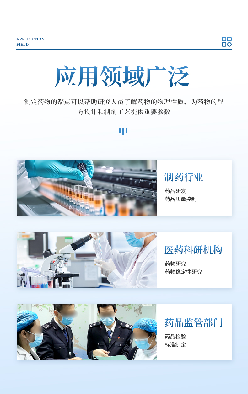 本儀器按《中華人民共和國藥典》2020年版四部 通則 0613凝點測定法要求設計制造,用于檢測化學試劑及藥物等凝固點。本儀器采用了模塊化設計,檢測部分采用了先進的傳感器,主控部分采用工業級PLC系統,控制性能穩定,制冷采用高性能壓縮機,具有降溫速度快,使用壽命長等優點。本儀器采用工業控制屏操作,樣品裝好后,一鍵開啟,自動往返式機械攪拌、自動顯示溫度曲線、自動判斷凝固點、自動打印測試數據。本儀器配有加熱和制冷,介質浴溫控范圍廣。