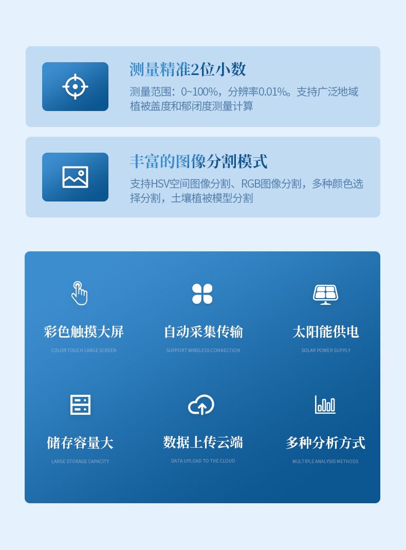 2. 測(cè)量范圍:0~100%,分辨率0.01%;支持HSV空間圖像分割、RGB圖像分割,多種顏色選擇分割,土壤植被模型分割。