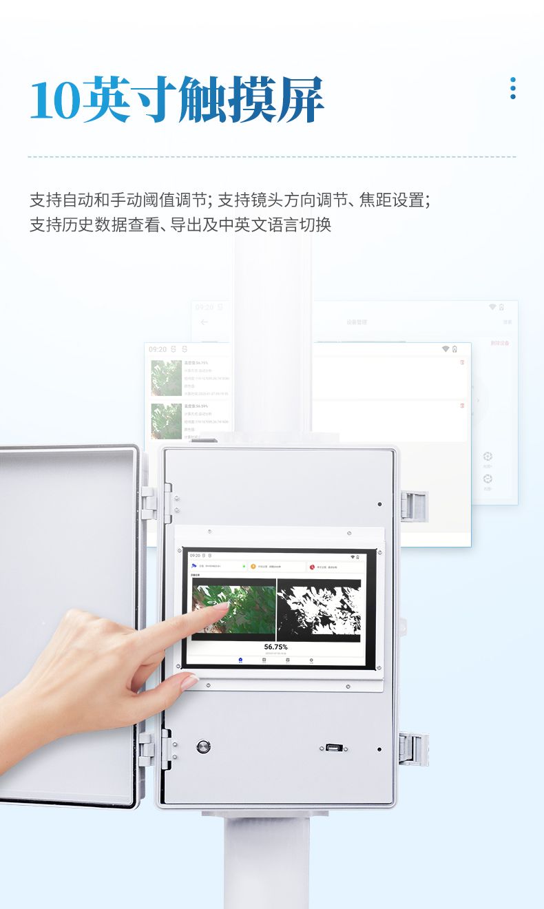 4. 分析主機(jī):10寸彩色觸摸顯示屏,支持自動(dòng)和手動(dòng)閾值調(diào)節(jié);自動(dòng)區(qū)分植被與非植被區(qū)域;支持鏡頭方向調(diào)節(jié)、焦距設(shè)置;支持歷史數(shù)據(jù)查看、導(dǎo)出及中英文語言切換。