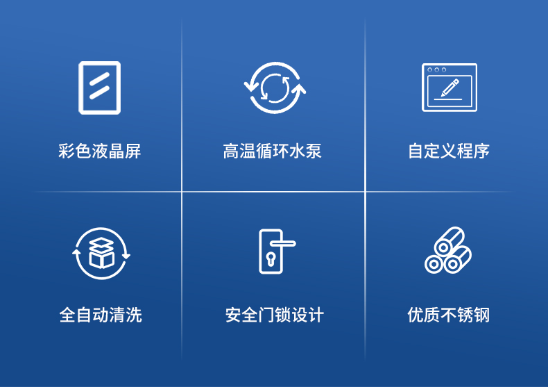 1.1全自動清洗,利用高溫、高壓水及清洗液持續噴淋器皿內外表面,清洗、烘干按照程序自動完成。