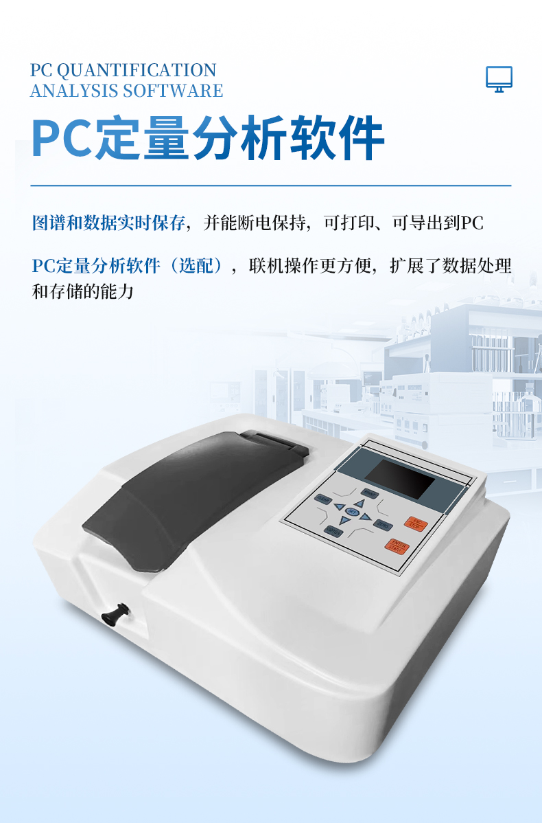 紫外可見分光光度計,功能實用,操作簡便。主機配有大屏點陣式液晶顯示器,可做光度測量和定量測試等,標準曲線圖譜直顯。選配PC定量分析軟件,增強了定量測試功能,增加了時間掃描、數(shù)據(jù)處理和報告打印等功能。廣泛應用于教學和日常分析等需求。